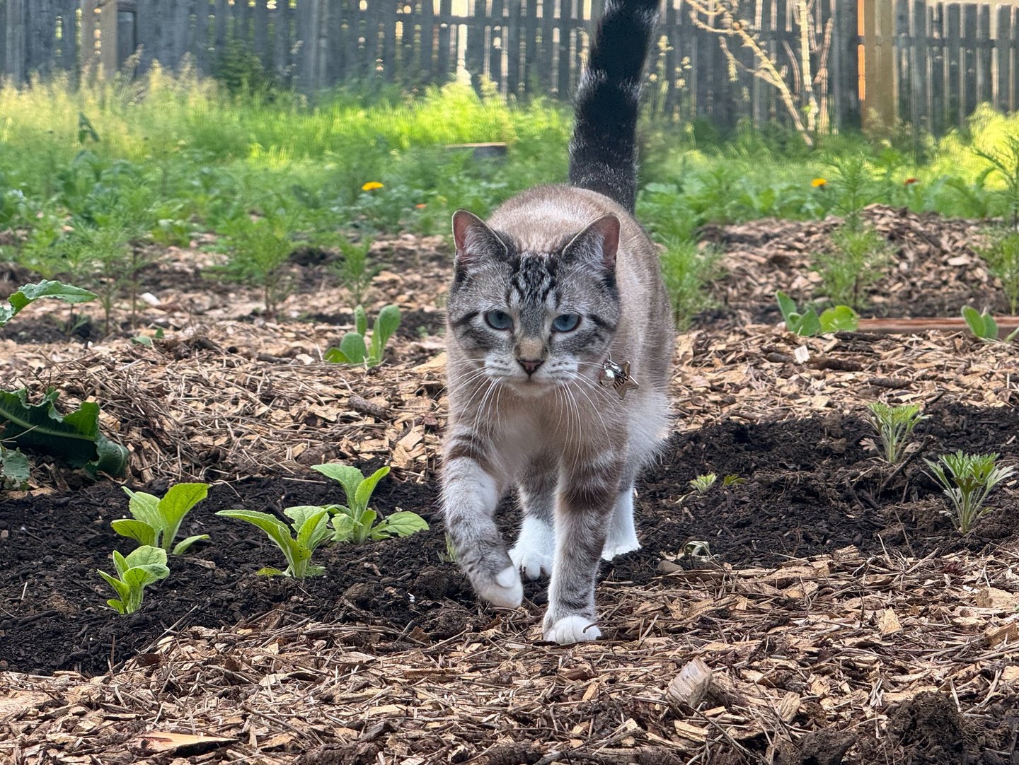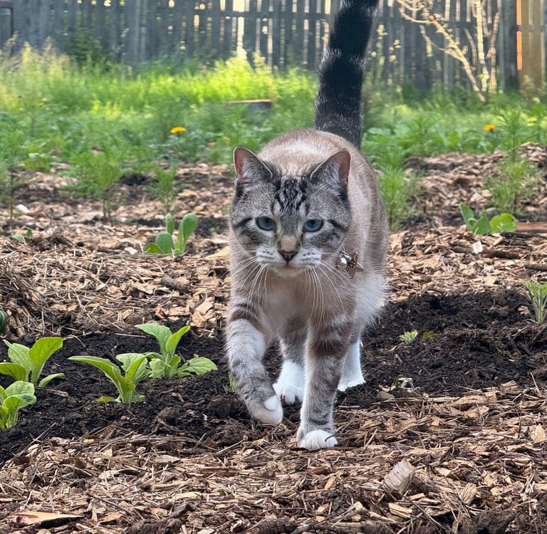 Moe is a beloved member of Sleepy Bee farm. He can be found hiding in the marigolds, climbing the oak tree, or meowing loudly for his neighborhood friends.