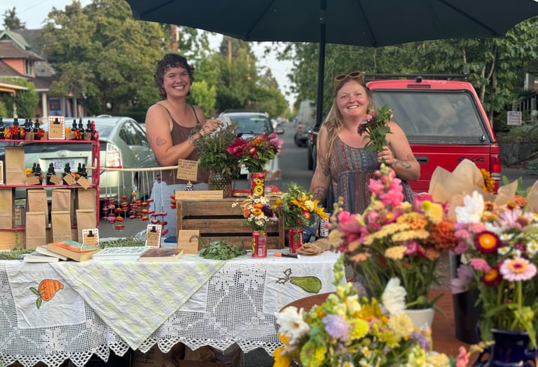 Sleepy Bee Flower Farm is a very small (micro, you might say) flower and medicinal herb production on 1/3 of an acre in the Cully neighborhood of Portland, OR. It is run by Bailey and Mae, who met while working on a veggie farm in 2021 and have been pals ever since. Having the kismet opportunity to move to a house together with ample growing space was an absolute delight. They made quick moves to prep the land and get some seeds started at the beginning of 2025 and see what kind of blooms could be put together in a year's time.